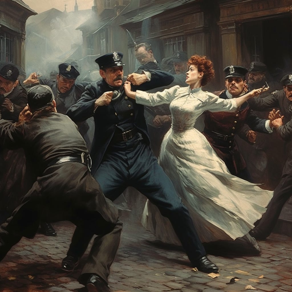 Suffragitsu came to prominence during the late 19th and early 20th centuries, coinciding with the zenith of the women's suffrage movement. Women who were fervently demanding their right to vote encountered resistance that occasionally escalated to violence. Men hellbent on being shitheads were showing up at Suffrage protests to beat up women. Sometimes, the cops helped.